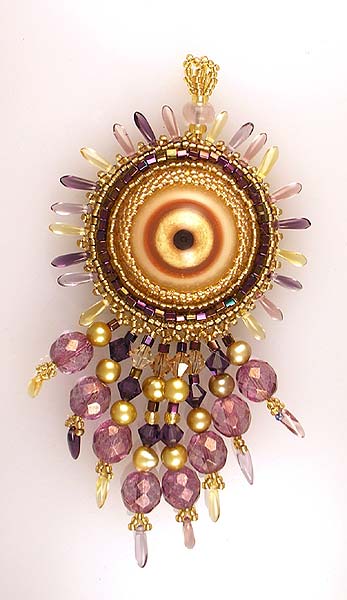 Just to let you know, starting Friday morning, I’ll have my beads and finished jewelry at the store full time, so you can really take a look at them . The kits are already there! Speaking of jewelry, there are two kits for the eye pendant (shown below & to the right) in the store, but the actual piece has sold already. Take a look at the back of the kit; neither of them are exactly as pictured (slightly different beads) and one of them has the glass coyote eye while the other has the hazel human one. Both of the kits show how to do basic bead embroidery, peyote stitch around a cabochon and also how to do the odd count peyote stitch needed to make eyelids (on photo below – the one to the right doesn’t have lids and NO it doesn’t look like a boob, Jodi), picot stitch edging and basic fringing techniques.