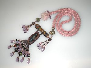 1) Fairie’s Garden:Verasite, Amethyst, Lampwork, Silk & Beaded Crocheted Cord, Swarovski crystal, Czech glass, Pearls