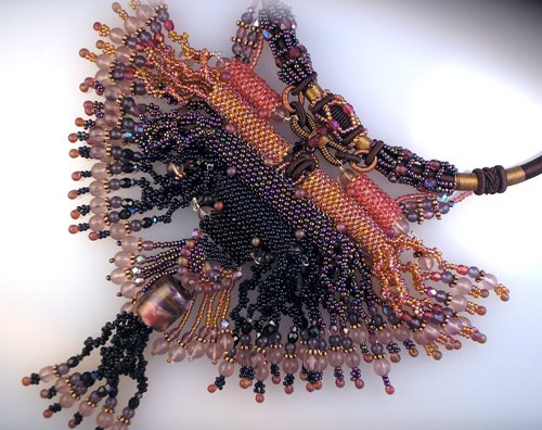 >I finally finished this version of the “Taos Sunset” necklace I had been using to demo at my class in Columbus in August. Its going into the Taos Center for the Arts Members show today.