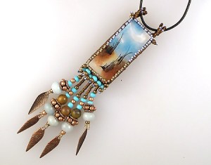 “Beachfront” is a Fused Glass Cabochon by Candi, from Glass Axis. Copper, glass & Agate Pendant. Approximately 3″ long at longest point. Approximately 1″ wide. Does not come with chain. Handmade Fused Glass Cabochon, Jasper, Agate, copper, Czech & Japanese Glass. Does not come with chain, is currently on Etsy (link above).