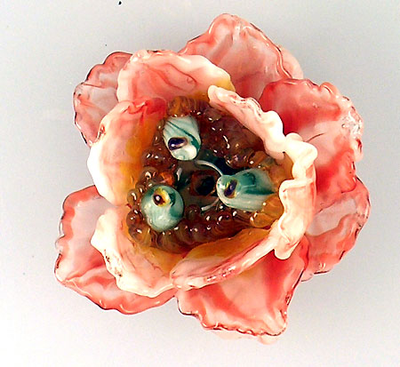 On December 7th, I’ll be doing a special class at Glass Axis on how to make these beads. I’ve been asked a number of times for a tutorial and am not yet ready to give written directions on these, but the class will cover the striped ribbon cane, a basic 3D flower with petals, the lily, and if we are adventurous and have time, the iris. There will be no written instructions, so come prepared to write! Students need to have taken at least one advanced lampworking class, more than one are helpful. Familiarity with boro is helpful. To register, contact me at GoodRiverGallery@aol.com or call Heidi during the work week at Glass Axis (412) 291-4250. I’m not sure of the pricing yet, but use of the minor torches, kilns, tools and all boro color/clear is included.