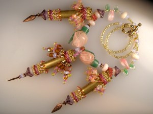 Made of rifle casings I found while hiking near the Rio Grande Gorge, seed beads, lampworked glass flower buds and lampworked spacer beads (stuffed into the bottom of the casing, difficult to see in the photos, but they are PINK!)