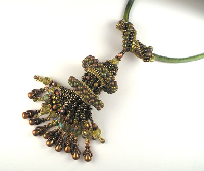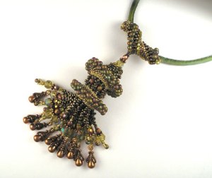 Instruction packet covers the a variation of Dutch Spiral Chain, the linked saucers used for the pendant, and a peyote fringing technique.