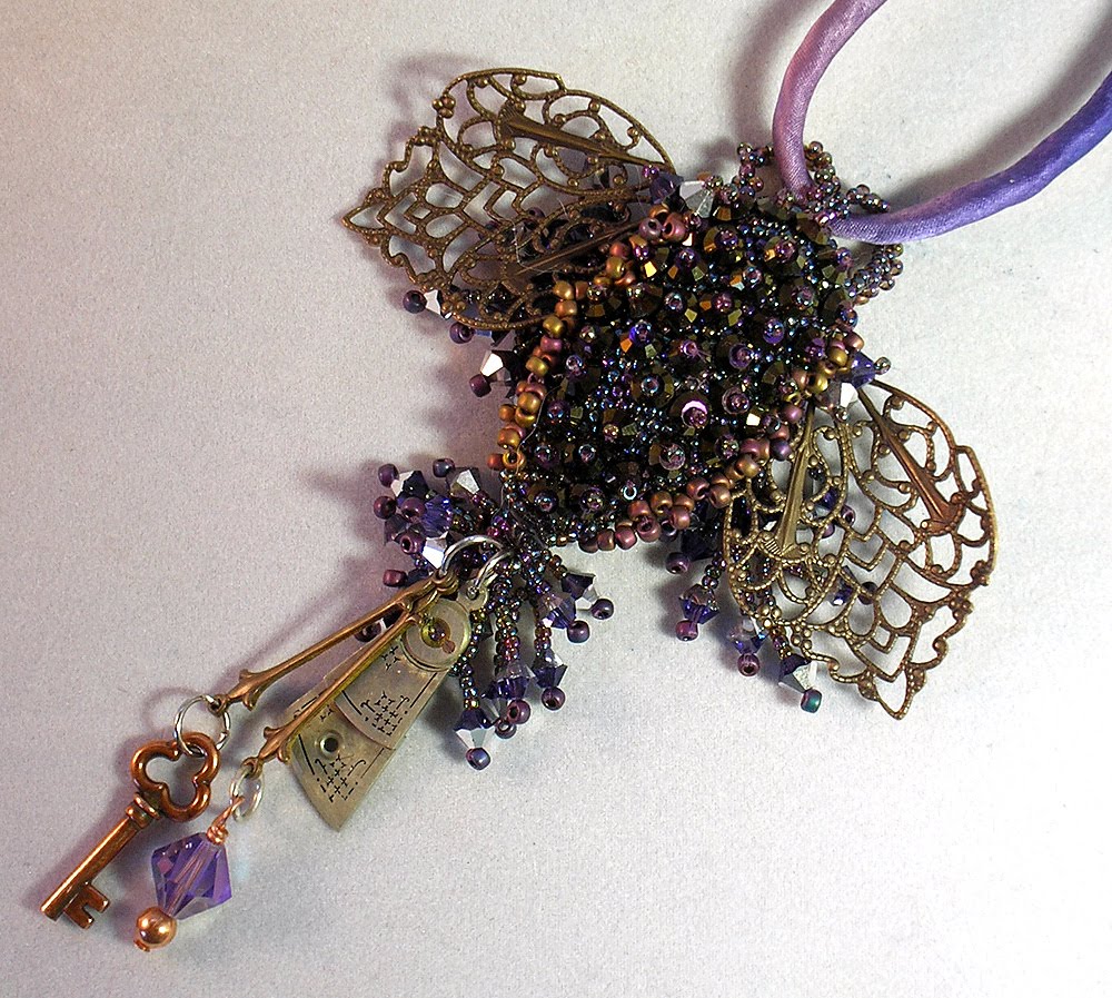This started out as something else, but has since turned into a bug, with a key. I don’t know, but its fun, and uses a peyote stitch base, Swarovski sequins and fringe. And its purple!