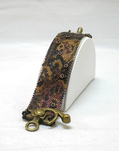 They all come with a listing of the exact color numbers you’ll need. They also come with a peyote graph and a word chart – you must know how to read these and know even count flat peyote stitch before you try these patterns except for the Japanese Screen, which teaches it to you. They also all discuss optional finishing and up to 8 clasping techniques. The smallest of these patterns is 10 pages long! All of these patterns are worked in peyote stitch. Please read the specs on the patterns to learn about anything special you might need to know before beginning these pieces.