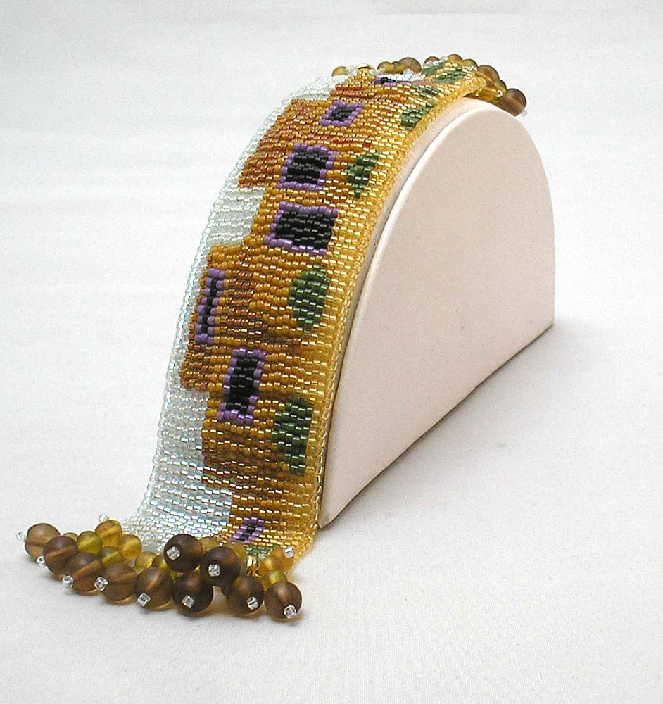 This piece is done in either square stitch or loomwork, your choice. The fringe hides a magnetic clasp. There are full stitching directions for the fringe, as well as multiple finishing techniques and a word chart and everything else my patterns always have. $10.00