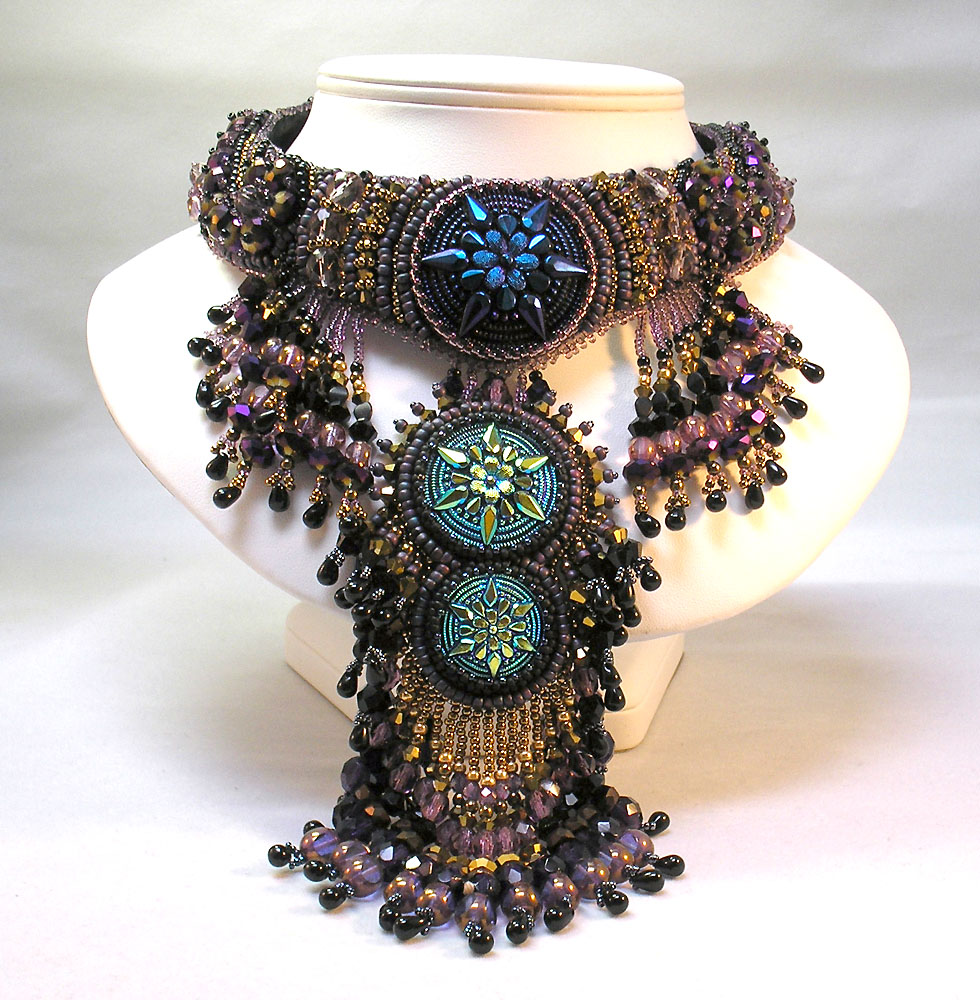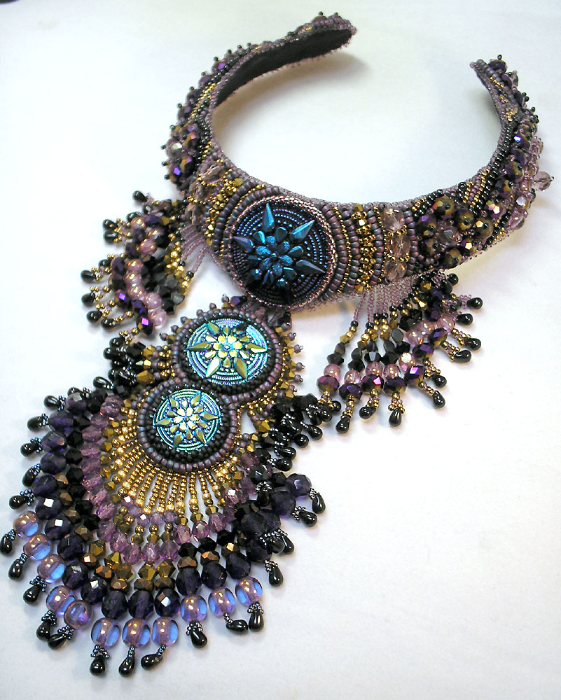 Then, I decided it was high time to add more STUFF to the pendant. I had purchased a brass necklace blank at Bead & Button, had leftovers from the two pieces I made from the Auntie’s Beads donation, and also had some leftovers from the Caravan Beads bracelet. So… after more bead embroidery and (again) too much fringe, here’s the finished piece.