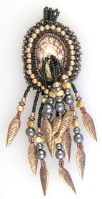 This variation on the square stitch creates a beaded bezel that will not only hold a cabochon securely but also will add beauty to whatever type of cab you choose: stone, glass or porcelain. The piece can then be embellished with fringe or accent beads and turned into a pin or necklace. Or as an alternative, you can apply the cabochon directly to a leather pouch or jacket, choosing colors that will highlight your central piece. Bezels can be created in beadwork out of either the square stitch or out of peyote. I prefer the square stitch for bezels on stones that have corners.