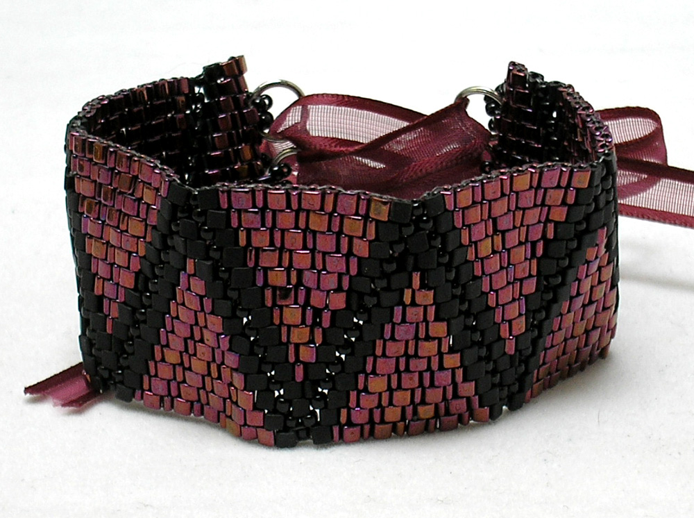 Interesting faceted effect with Toho triangle and a steampunk influence. Uses even count peyote stitch, with a twist!