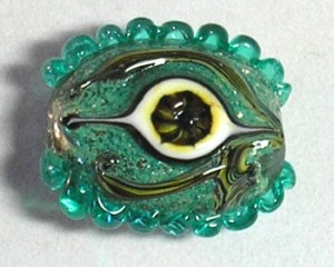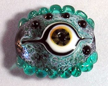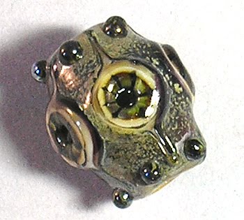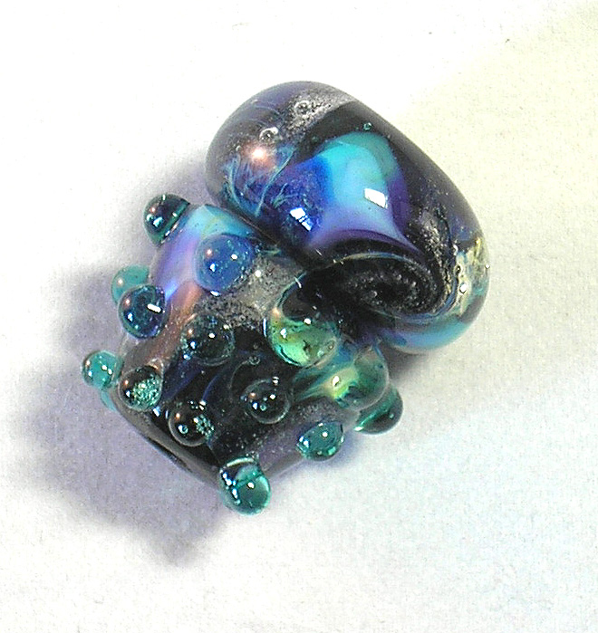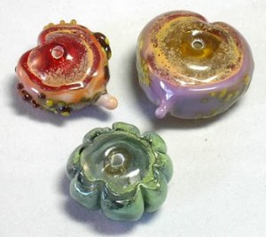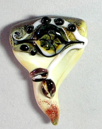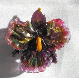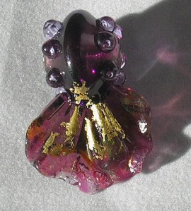 Purple & Gold. What’s not to love? Holy HECK but it was hard to make an orchid out of the soft glass. I’m back to boro for those boogers. I actually made that top bead into a finished DN spiral necklace. I’ll try to find the photos…