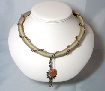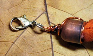 Wrap a piece of your wire around the chain and taped edge. Do it really really REALLY tightly. Add a bunch of glue right at the top of the tape. This will help keep your silk from fraying also, and acts as extra insurance in case your wire wrap wasn’t tight enough. Run the wire up through the bead/cord cap. I like adding a matching bead up here to make the back look as nice as the front. Wirewrap your clasp onto the piece.