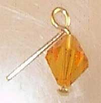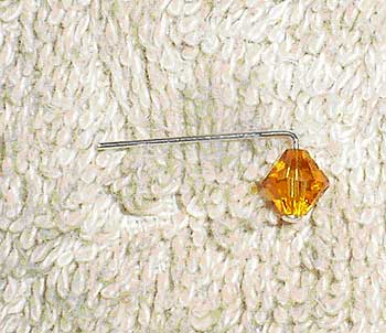 Slip a bead (shown is a Swarovski, but you’ll be using your focal) onto a head pin, and using round nosed or needle nosed pliers to bend the head pin over. If your lampwork bead hole is too big for the little “head” on that head pin, block it up with some smaller beads, one above and one below your bead. See the little space between the headpin and the 90-degree bend? You want this, but you only want a little bit of room there (no more than 1/16”).