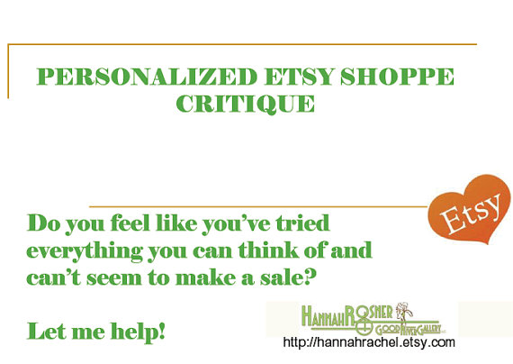 I have been a successful Etsy store owner since 2008. In the past year alone, I made a number of changes to my shops and have sold over 1000 items. Can you do what I’ve done? You bet! I’ll look at your shop and send you a 4-page PDF citing exactly what you need to think about. Please allow 1 week (generally its less) for me to prepare this for you. Available at http://wwwhannahrachel.etsy.com/
