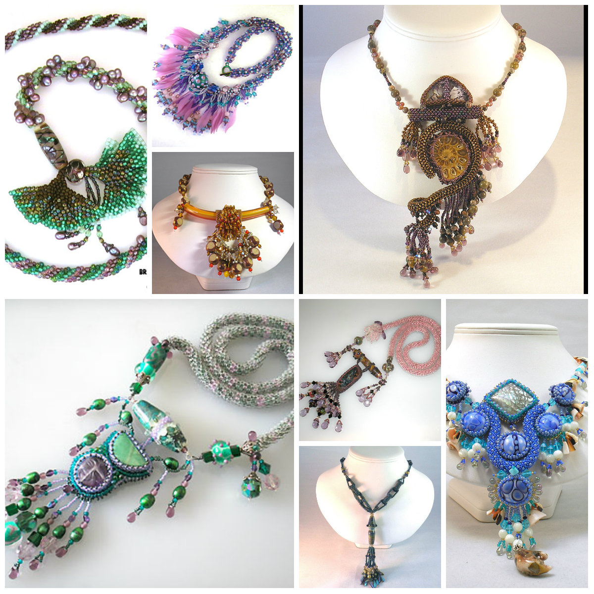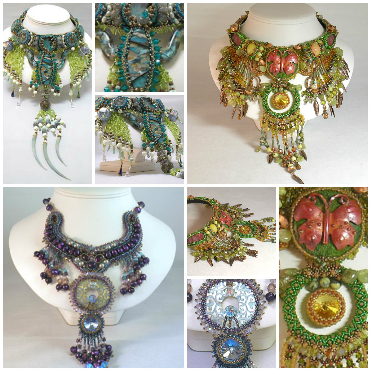 And here’s a set of beaded collars. The top right one was made for the Use The Muse Contest 3. The top left won third place in the beads and jewelry category at the Vegas Glass Craft Expo 2011. The bottom left won the Bead Embroidery Category for the use the Muse Contest 2. All of them are available for sale on my website.