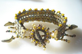 ![]() Brocade and Bead Embroidered Bracelet TUTORIAL $12.00 BEGINNING PROJECT Use seed beads and brocade ribbon to make your own version of this hand beaded bracelet. The width of the finished bracelet depends on the brocade you use.