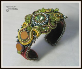 We’ll be doing the soutache beaded bracelet class (see photo below) and also the Dragon Scales bracelet with a custom clasp using brand new Rizo beads!