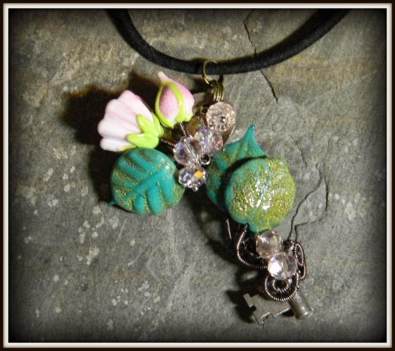 I had a vintage key that i’d been planning on adding some crystals and some leftover lampworked flowers/buds/leaves to. I’ve been goofing around with wirewrapping lately (weird for me, I know) so has been planning this piece. Deadlines are really good for me…