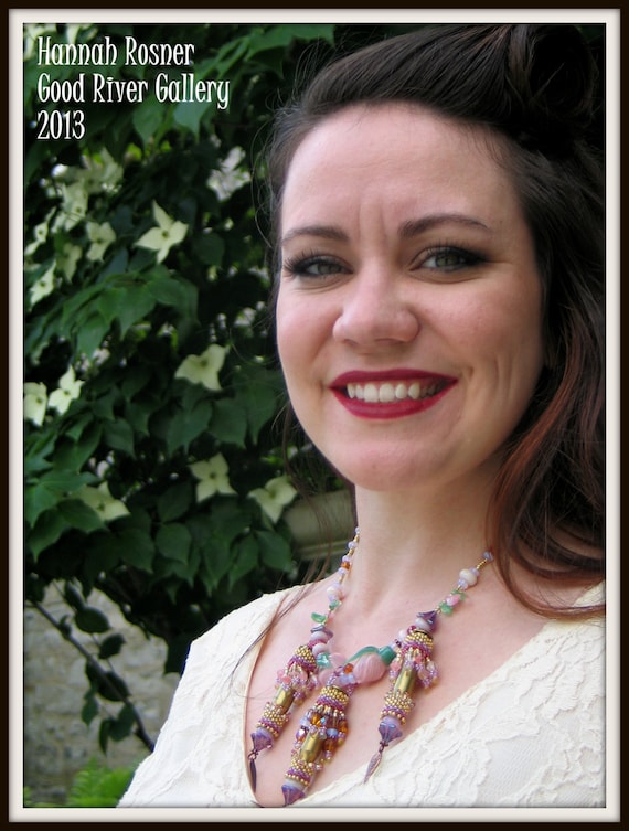 New Mexico town’s celebration of the 40th anniversary of Dennis Hopper’s “Easy Rider.” Hopper lived in Taos, and the town geared up for a summer-long festival spanning many of the museums and galleries. Made of a rifle casing I found while hiking near the Rio Grande Gorge, seed beads, and a lampworked spacer bead. The idea? Make Love, not War, of course.