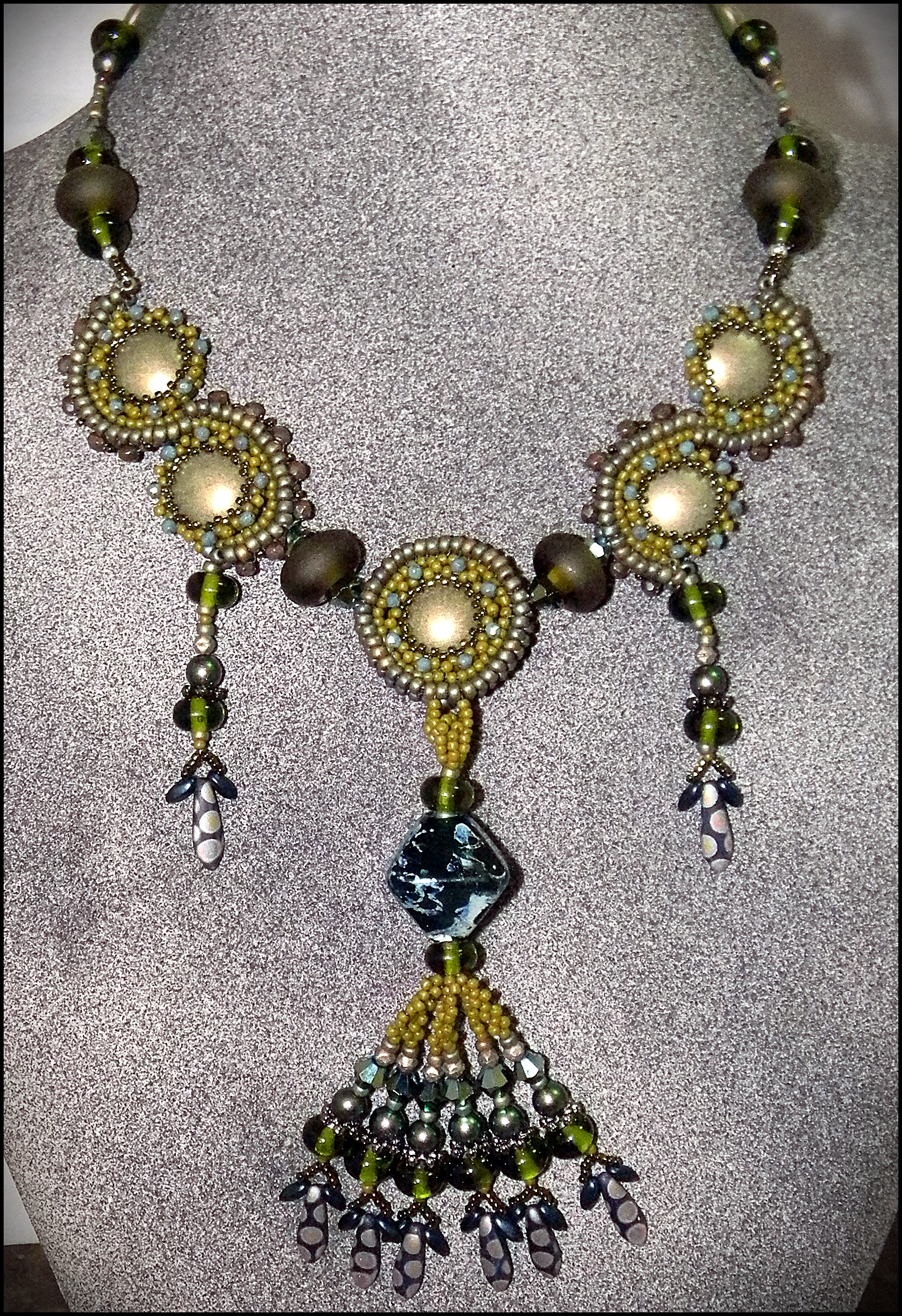 Catalog Please select your category from the list below. BEADS •FOCAL •FLOWERS •OSU – BUCKEYE SPIRIT •RECYCLED GLASS [caption id=u0022u0022 align=u0022alignrightu0022 width=u0022115u0022 caption=u0022Image via CrunchBaseu0022][/caption] • EARRINGS BRACELETS •FANCY CUFFS •SEED BEADED •LAMPWORK KITS u0026amp; TUTORIALS •LAMPWORK TUTORIALS •BEGINNING/INTERMEDIATE BEADWEAVING u0026amp; WIREWORKING •PEYOTE STITCH AND BEADWOVEN CUFFS •ADVANCED BEADWOVEN KITS u0026amp; TUTORIALS • NECKLACES PENDANTS • SEED BEADED • GLASS FLOWERS • PURSES • SCULPTURAL WORK • WHOLESALE INFO FEATURED: Northern Lights (photo at top of page) Created as both a challenge from Aunties beads u0026amp; also as the June Etsy Beadweaver’s Challenge. Clive Henderson from Auntie’s Beads contacted me and asked me to make a piece with some of the beads from his site. Shiny pretty things and a deadline from both he and also Bead u0026amp; Button? I’m so on it! This bead embroidered pendant has my signature “too much fringe.” The central three pieces are vintage buttons I’ve been hoarding, but all the fringe beads are stuff I got from Auntie’s Beads and from a challenge I did for Caravan Beads Chicago. Its more vibrantly purple in person than on my screen.